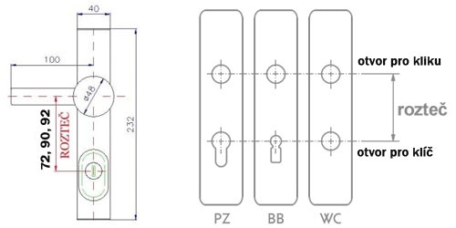 U rozetového kování vám odpadne starost s měřením rozteče, to je naopak základním parametrem při koupi štítového kování. Jedná se o vzdálenost mezi osou klíče a osou kliky. Standardně se jedná o vzdálenost 72 nebo 90 mm, u bezpečnostního kování 92 mm. Ale jak bylo řečeno, vše má své, a i při koupi rozetového kování je třeba si dát na něco pozor. Většina rozetových kování se upevňuje přišroubováním, je proto nutné, aby v zámku byly pro kování určené otvory.