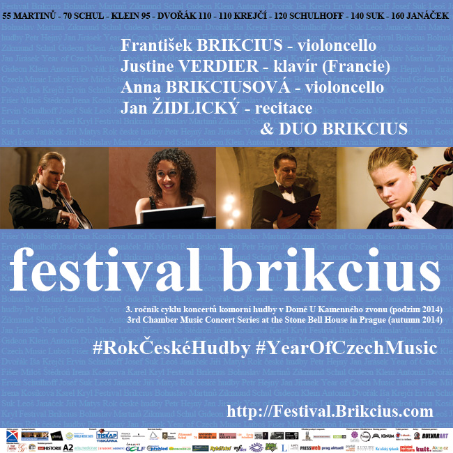 "Festival Brikcius" - 3. ročník cyklu koncertů komorní hudby v Domě U Kamenného zvonu v Praze (podzim 2014) & Rok české hudby, který letos připomíná 55. výročí úmrtí Bohuslava Martinů, 70. výročí úmrtí Zikmunda Schula, 95. výročí narození Gideona Kleina, 110. výročí úmrtí Antonína Dvořáka, 110. výročí narození Iši Krejčího, 120. výročí narození Ervína Schulhoffa, 140. výročí narození Josefa Suka, 160. výročí narození Leoše Janáčka a Daniel Pearl World Music Days, se koná pod záštitou primátora Hlavního města Prahy Tomáše Hudečka, pod záštitou starosty Městské části Praha 1 Oldřicha Lomeckého, ve spolupráci s Městskou částí Praha 1 a s Galerií Hl. m. Prahy, v Domě U Kamenného zvonu na Staroměstském náměstí v Praze. Koncerty se konají na podzim ve vybrané čtvrtky, od 19:30 hodin. Více informací je k dispozici na webových stránkách http://Festival.Brikcius.com .